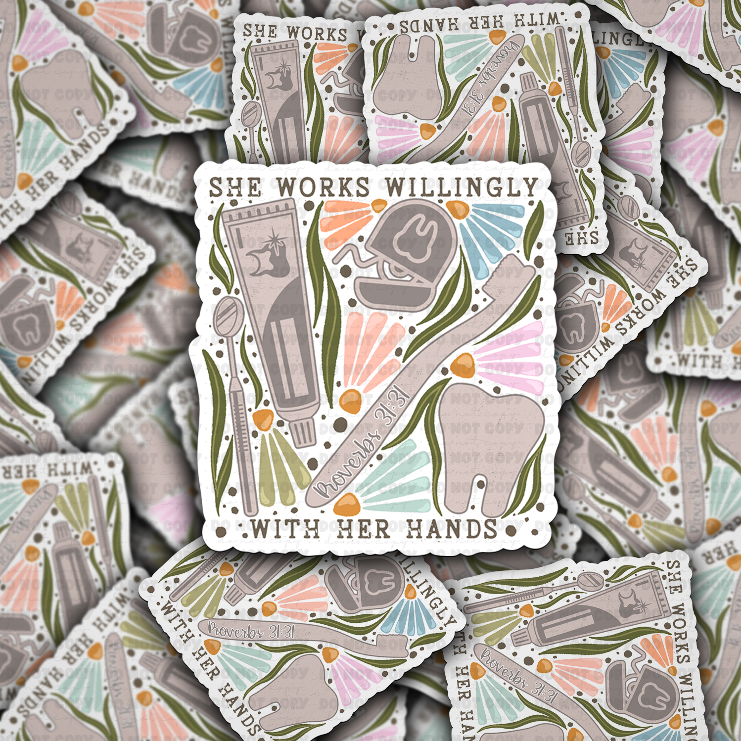DC 1434 - She works willingly with her hands dentist die cut sticker