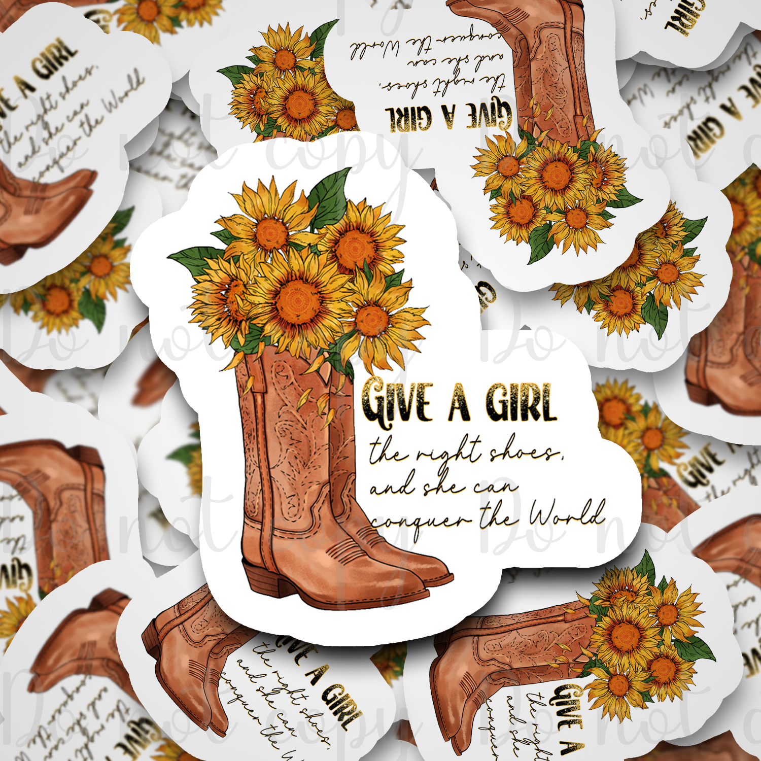 Give the girl the right shoes and she can conquer the world wester sunflower boots Die cut sticker 3-5 Business Day TAT